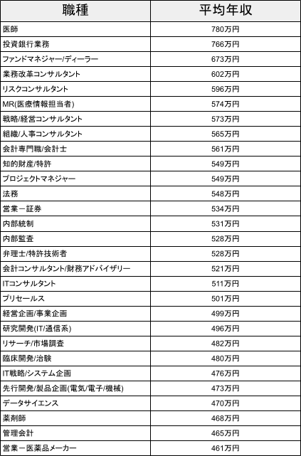 女性が、日本人の平均給与458万円を達成しやすい職種にはどのようなものがあるのでしょうか。「女性の転職・求人情報 Woman Career by doda」の「女性の平均年収ランキング 職種別【最新版】」を元に確認していきましょう。
