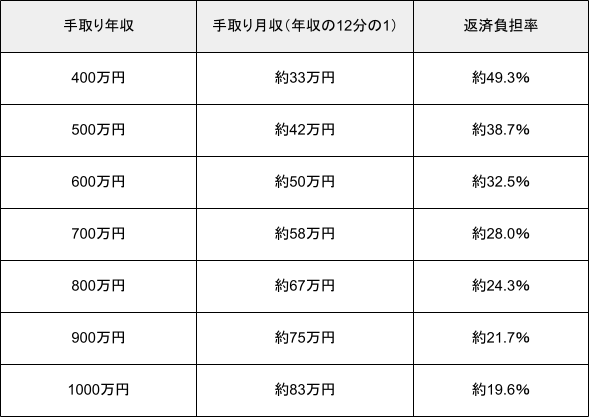 手取り年収ごとの返済負担率を確認