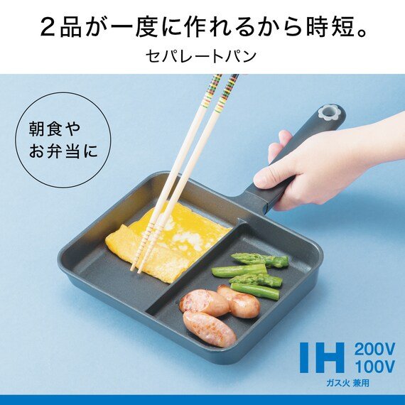 真ん中に仕切りの入ったフライパンです。一度に2品のおかずが調理できるので、忙しい朝のお弁当作りで大活躍すること間違いありません。フッ素樹脂加工されているので、食材が内側にこびりつきにくく、毎日使うのが苦にならないのもうれしいですね。