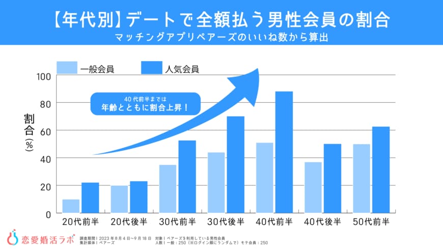 デートで全額払う人の割合は、本格的に結婚を意識する30代前半から急激に増加していることから、経済力のある男性が人気のようです。
