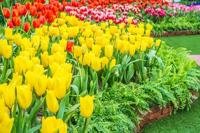 春の花壇といえば、やっぱりチューリップ。赤・白・黄色をはじめ、多彩なカラーで春花壇を色鮮やか彩ってくれます。