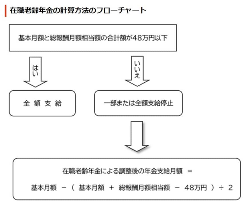 [基本月額+総報酬月額相当額]が48万円以下の場合は全額支給に、[基本月額+総報酬月額相当額]が48万円超の場合は、以下の計算式で求めた金額が支給されます。