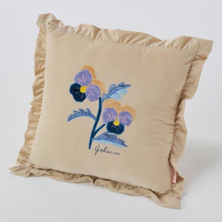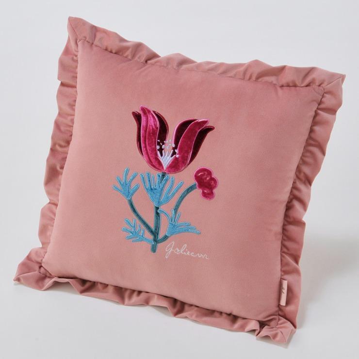 こちらはベロア使いのアップリケがおしゃれな背当てクッションです。ボリューム感のあるフリルが素敵です。先ほどご紹介したマットと組み合わせて使ってもおしゃれです。