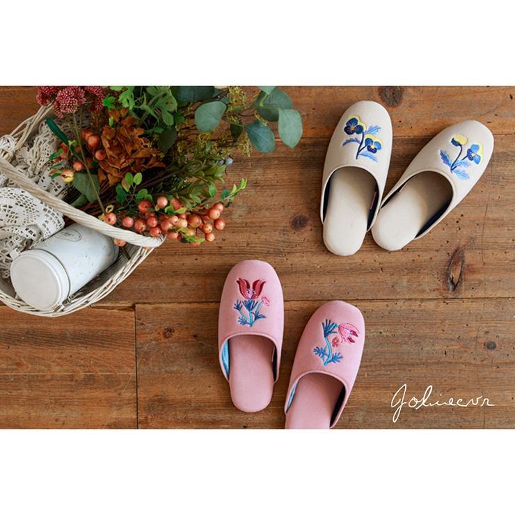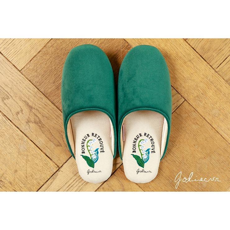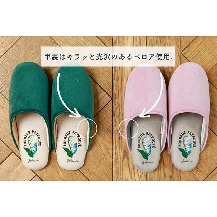 こちらは光沢感のあるベロア素材と刺繍がおしゃれなルームシューズです。ふんわりとしたクッションが使われているので、履き心地も良いです。