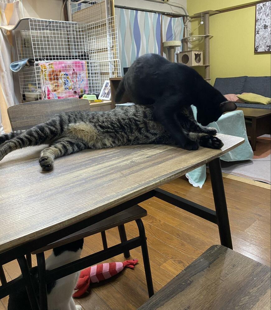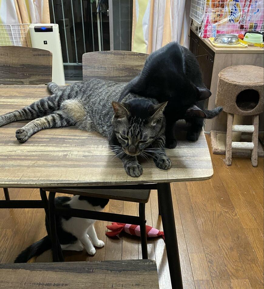 そこに写るのは、黒子猫の「コンブ」くんとキジトラ猫の「シイタケ」くん。テーブルの下にはハチワレ猫の「モズク」ちゃんもいます。