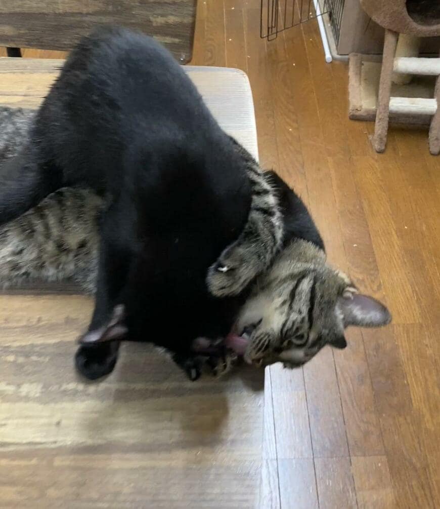 この日の2匹は、テーブルの上で激しいじゃれ合いをしていた様子。コンブくんは、横たわるシイタケくんに覆いかぶさるようにして遊んでいるようです。