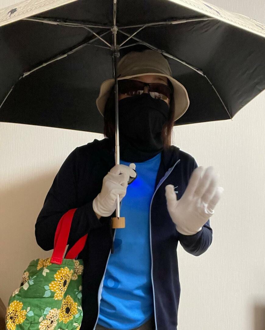 そこに収められていたのは、隙のない日焼け対策をする女性の姿。日傘に帽子、サングラス、フェイスマスクに手袋と、完璧すぎる対策でもはや誰だか認識できません。