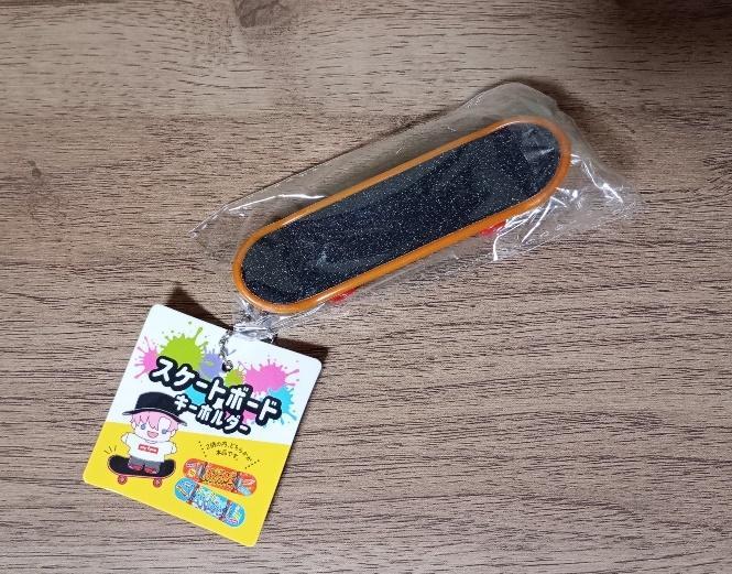 こちらがセリアで販売されている「フィンガーボード」です。商品名は、「スケートボードキーホルダー」です。ボードの長さは9.5cm(筆者実測値)です。