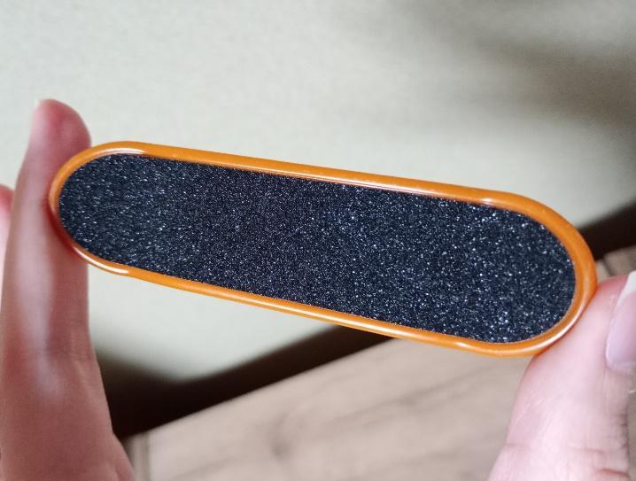 「スケートボードキーホルダー」には、写真のように滑り止めもついています。爪磨きと同じくらいザラザラしています。
