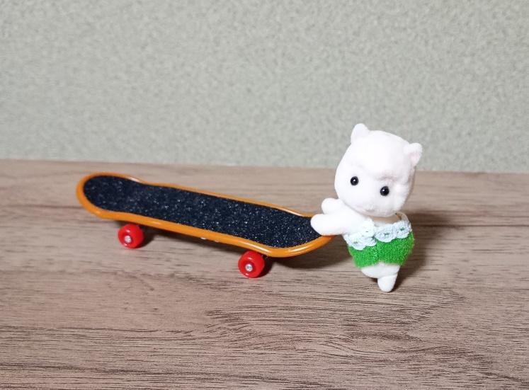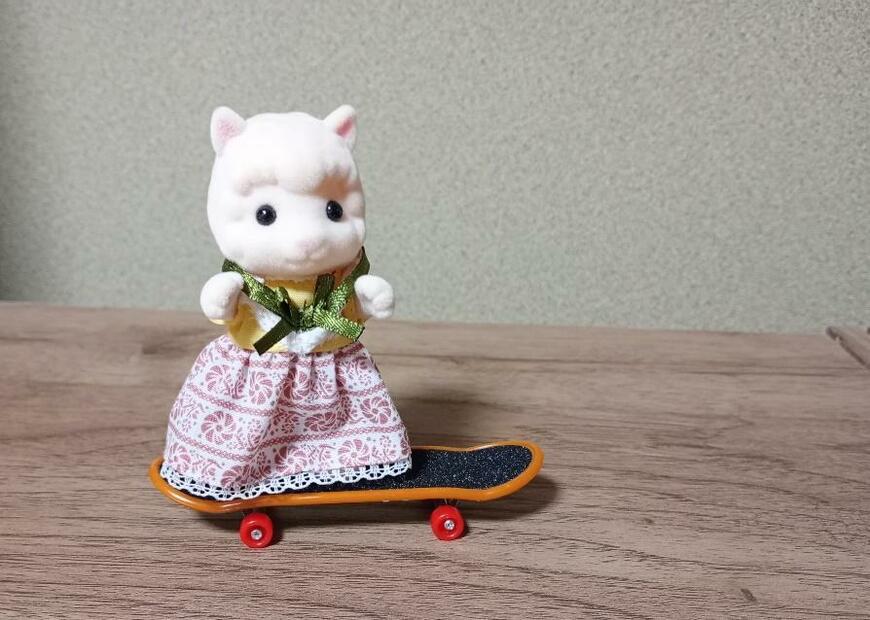セリアのフィンガーボード「スケートボードキーホルダー」は、シルバニアやぬいぐるみにもぴったりです