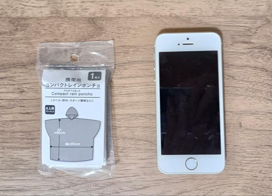 1. 4インチのスマホよりも小さいサイズのレインコートです! ダイソーの「コンパクトレインポンチョ」