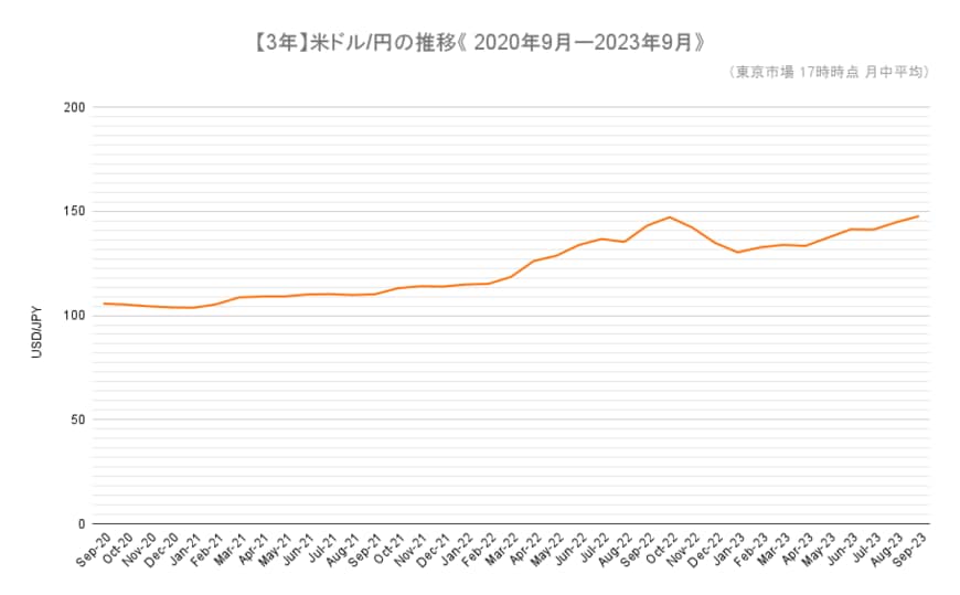 2020年9月~2023年9月の米ドル/円の為替レートの推移は以下の通りです。