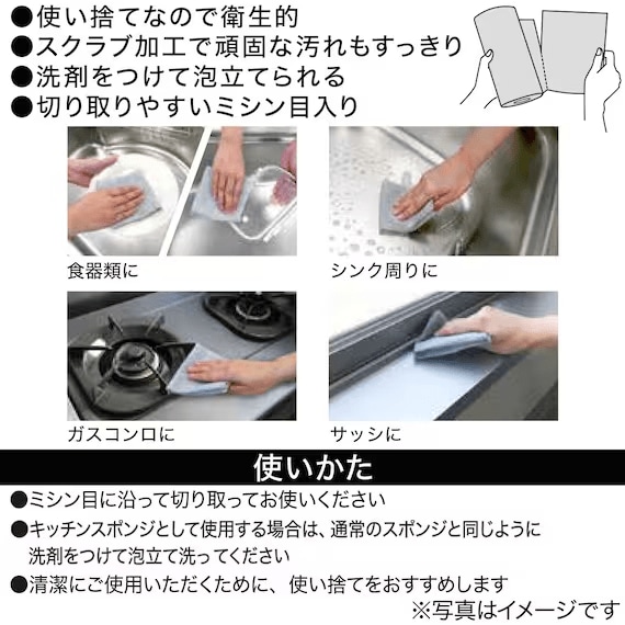 ミシン目に沿って切り取ることのできるお掃除用のクロスです。スクラブ加工がされているため、汚れ落としに力を発揮してくれます。特に汚れが酷い場所には洗剤をつけて泡立てた上でこすり磨きをすると効果的ですよ。