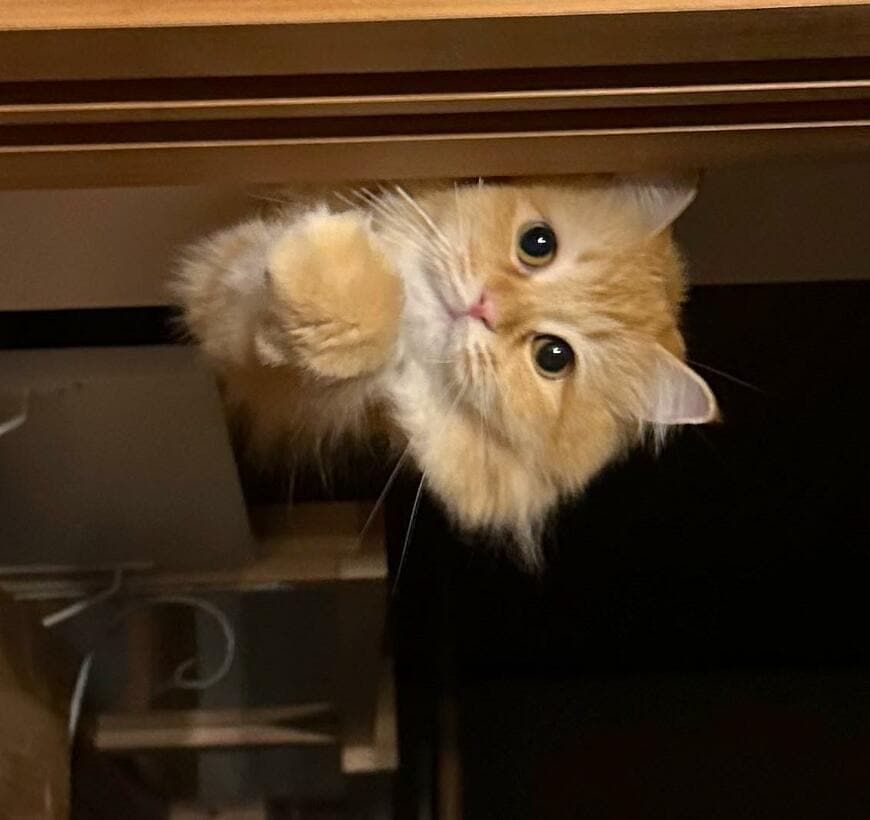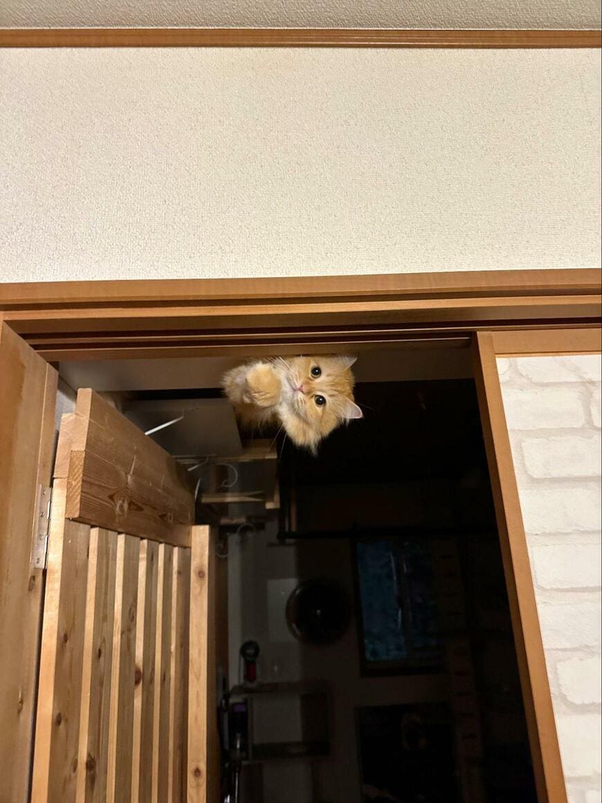 天井から逆さまに生えているかのような、猫さんの姿がX(旧Twitter)で注目を集めています。