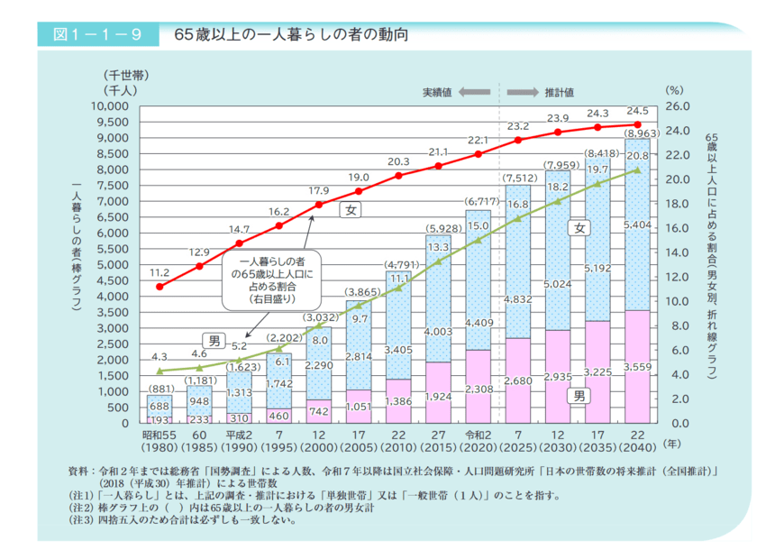 この中には、生涯未婚である方に加え、配偶者との死別・離別を経験した方も含まれます。