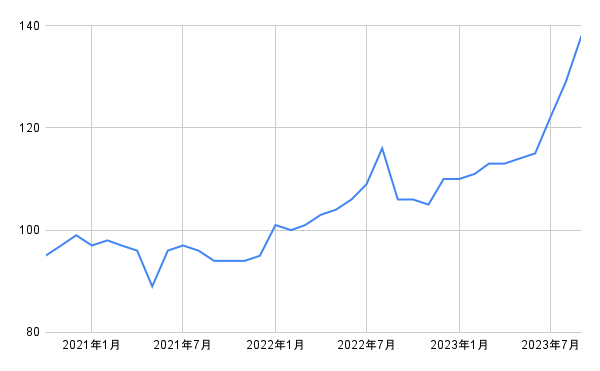 なお、全都市の小売価格の平均は119円(2023年9月時点)、前年同月比では9%の伸びとなっています(いずれも小数点第一位を四捨五入)。