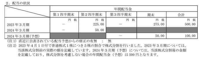 信越化学工業の株式を1年前に買い、持ち続けたとすると、「2023年3月期の期末配当」と「2024年3月期の中間配当」の計2回を受け取ることができます。