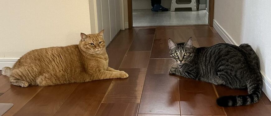 2匹は互いに向き合いながら「なんだニャ」とでも言いたげな、少々圧を感じる表情を浮かべています。