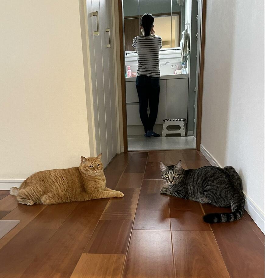 ボディガード…?ママさんの背後で「強力な門番」のように立ちはだかる猫たちがX(旧Twitter)で注目を集めています。