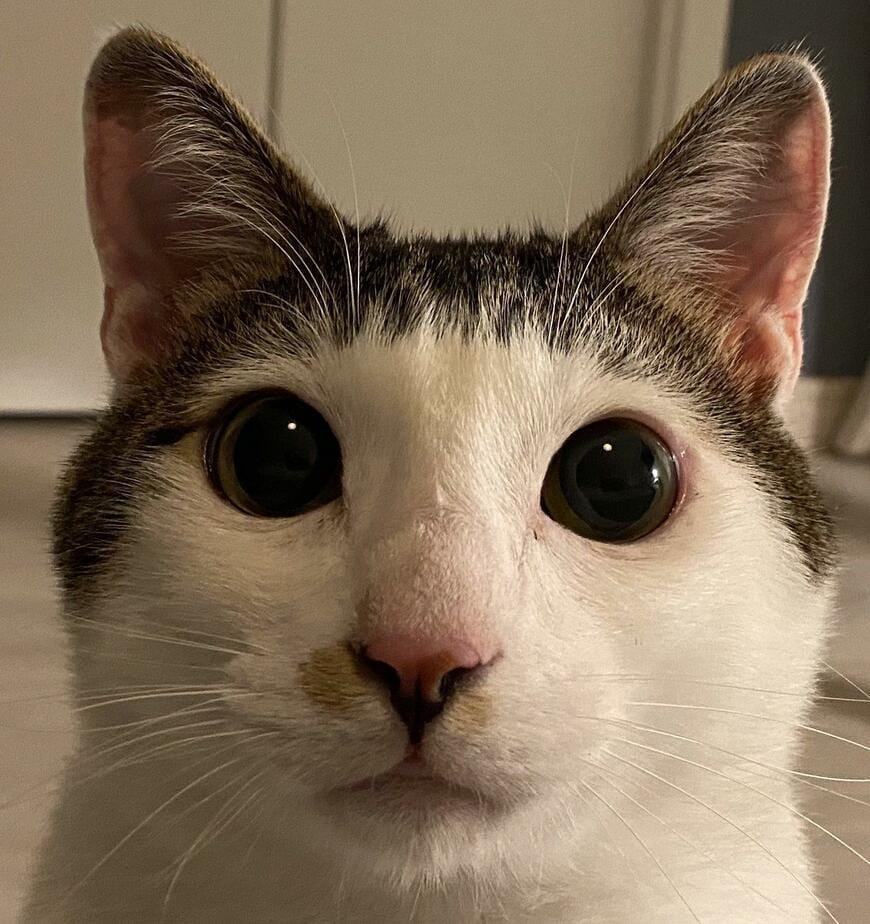 ヘルメットを装着しているかのような「髪型」の猫ちゃん。おもしろ可愛いドアップ姿がX(旧Twitter)で注目を集めています。