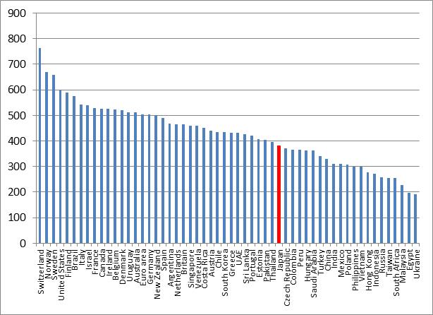 では、直近の2017年7月の調査結果を見てみましょう。下図のように、スイスのビックマックが762円であるのに対して、日本は380円と約2倍の開きがあります。