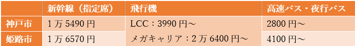 今回は、兵庫県の旅行先として特に人気がある神戸市と姫路市へのアクセス手段と交通費の目安を紹介します。神戸市・姫路市への主な交通手段と片道の交通費の目安を、以下の表にまとめてみました。