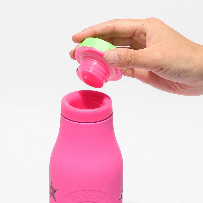 スターをモダンに描いたスタイリッシュなステンレスボトルです。今年らしいビビッドなネオンカラーが印象的ですね。いろいろな表現方法で描かれたスターのアートワークがデザインの特徴に。正面のサイレンロゴをデボス加工で表現しています。