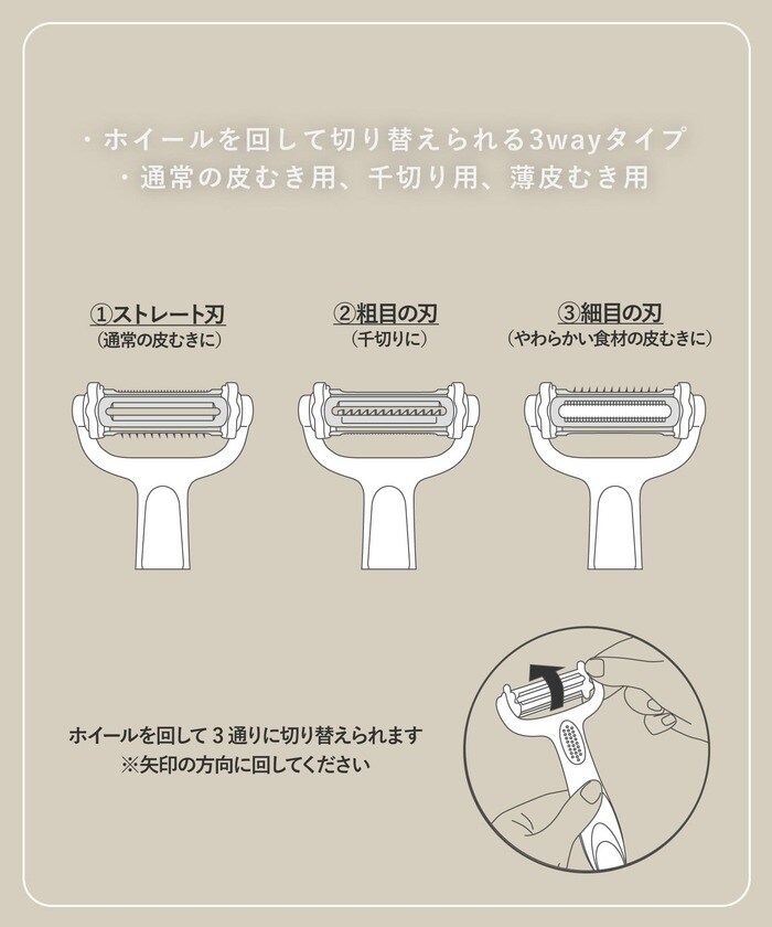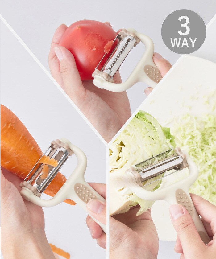 3通りの使い方が可能な多機能ピーラー。通常の皮むきはもちろん、刃を切り替えることでトマトなどの柔らかい食材の皮むき、キャベツの千切りなどが可能です。