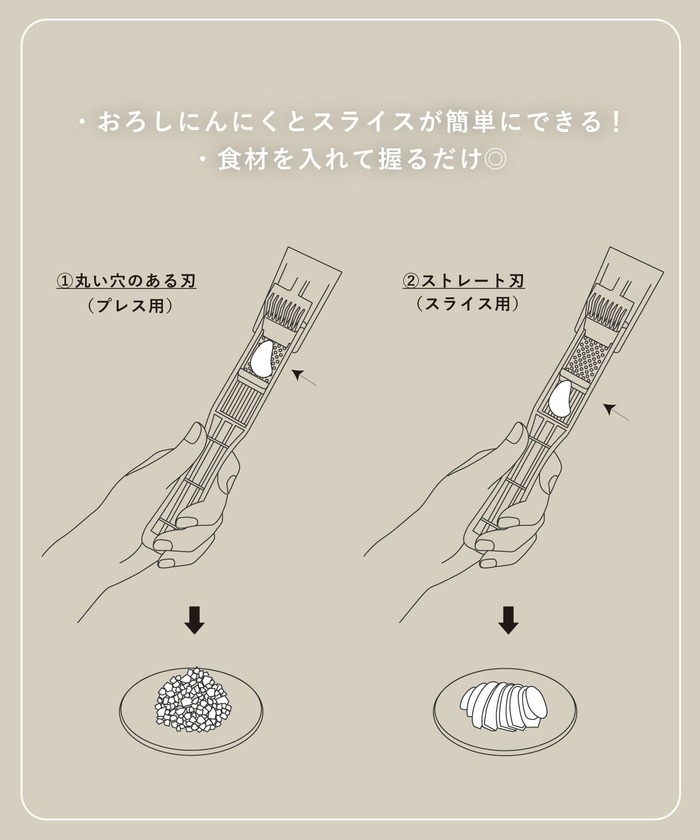 にんにくの下ごしらえが楽になるガーリックプレス&スライサー。にんにくをセットして握るだけで、簡単におろしにんにく、スライスにんにくができます。包丁やおろし器よりも手間が少なく、手にニオイもつきにくいです。