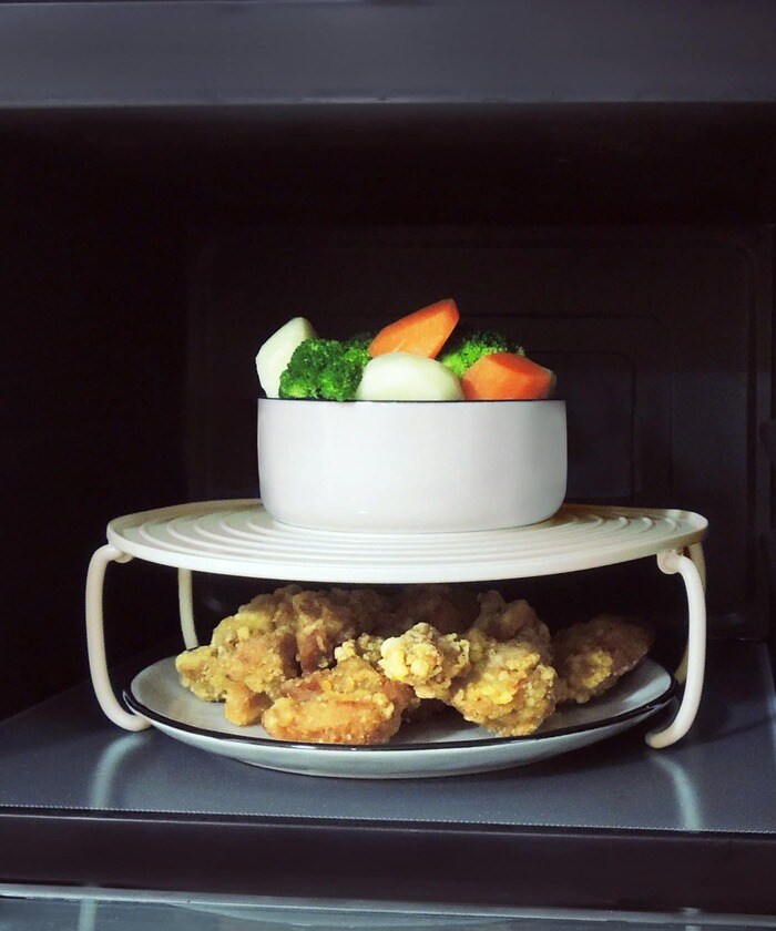 電子レンジで2皿同時に温められるトレイ。時短調理、電気代節約に便利です。レンジだけでなく、食器棚などに設置して収納力をアップさせるのにも役立ちます。脚を折り畳める仕様なので、省スペースで収納可能です。