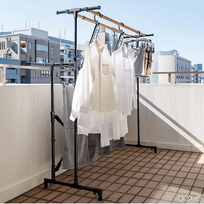 限られたスペースのベランダを最大限に活用できるベランダ物干し。伸縮式ハンガーポールが付いており、竿の間のスペースも有効活用できます。