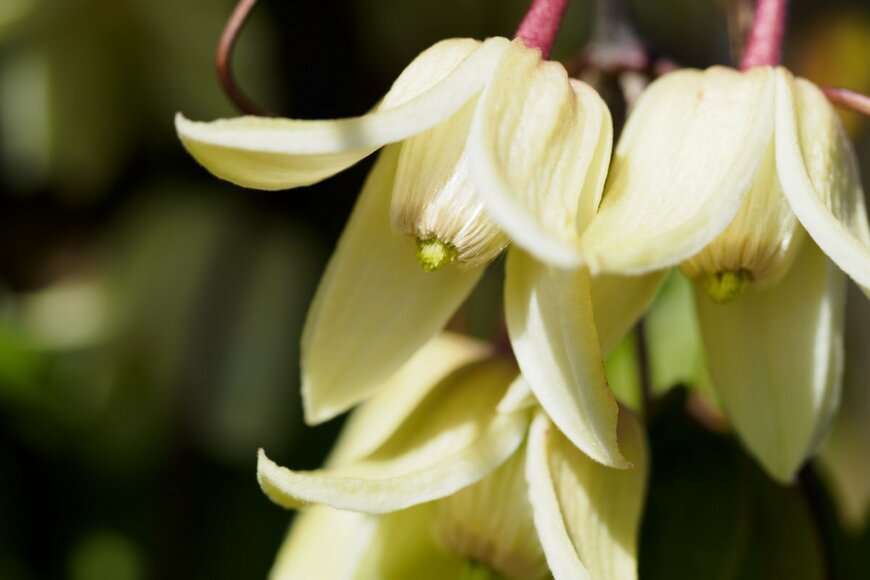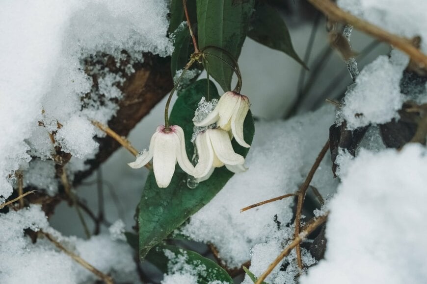 やや肉厚の花弁がぽってりとした印象の「ヘンリー」。冬に開花する常緑性の冬咲きクレマチスです。