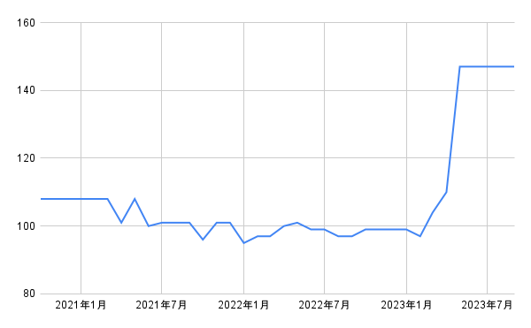 なお、全都市の小売価格の平均は128円(2023年9月時点)、前年同月比では10%の伸びとなっています(いずれも小数点第一位を四捨五入)。