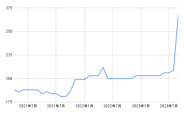 なお、全都市の小売価格の平均は210円(2023年9月時点)、前年同月比では5%の伸びとなっています(いずれも小数点第一位を四捨五入)。