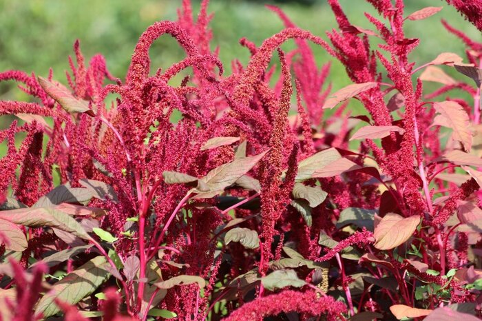 アマランサス・クルエンタスはグアテマラが原産地。赤く長い花穂が情熱的で、葉も赤味を帯びています。直立する長い花穂は見応えがあり、庭の主役としてオススメです。