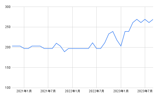 なお、全都市の小売価格の平均は247円(2023年9月時点)、前年同月比では8%の伸びとなっています(いずれも小数点第一位を四捨五入)。