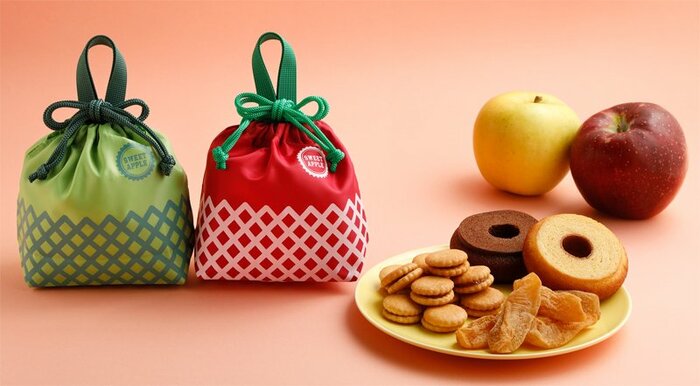 今年は、ネットに入ったりんごをモチーフにしたキュートなデザインの巾着袋がラインナップ。青りんごをイメージしたグリーンと、赤いりんごをイメージしたレッドの2色展開です。