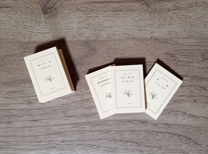 一冊あたりのサイズは、3.5cm×5cm(筆者実測値)です。親指くらいの高さの豆本です。小さいアイテムですが、タイトルや新潮文庫のロゴがきちんと印刷されています。