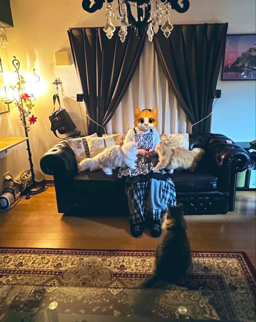 優雅な雰囲気でくつろぐ、3匹の猫ちゃんとママさん
