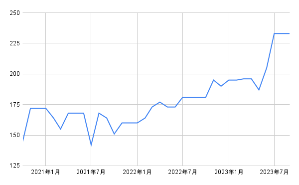 なお、全都市の小売価格の平均は195円(2023年9月時点)、前年同月比では9%の伸びとなっています(いずれも小数点第一位を四捨五入)。