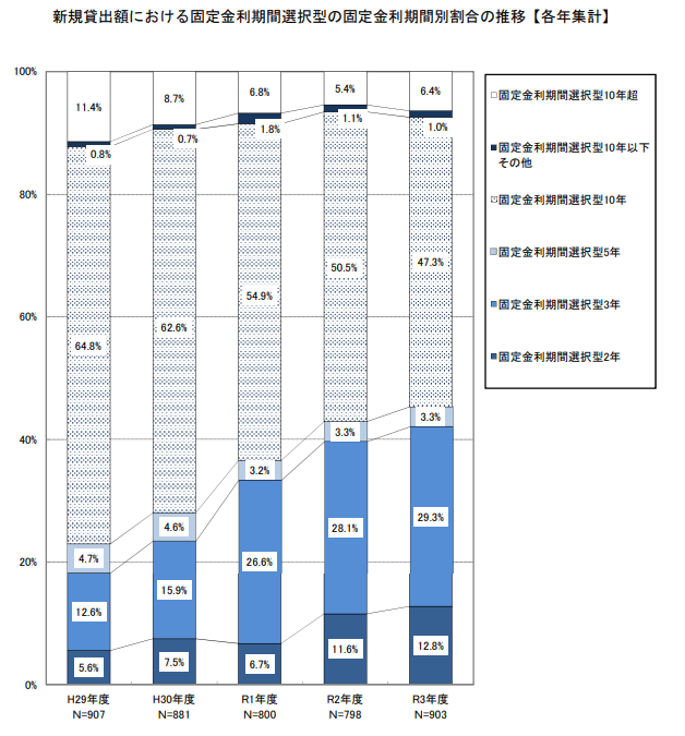 国土交通省が公開した「令和4年度 民間住宅ローンの実態に関する調査 結果報告書」によると、令和3年度の固定期間選択型の固定期間別の割合は以下のようになっています。