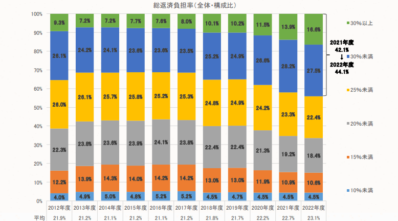 また、25%未満の割合も2021年と2022年を比較すると上がっていることから、返済負担率は上昇傾向にあると言えるでしょう。
