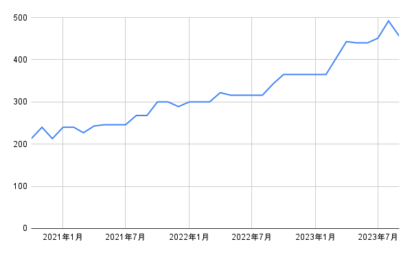 なお、全都市の小売価格の平均は467円(2023年9月時点)、前年同月比では0%の伸びとなっています(いずれも小数点第一位を四捨五入)。