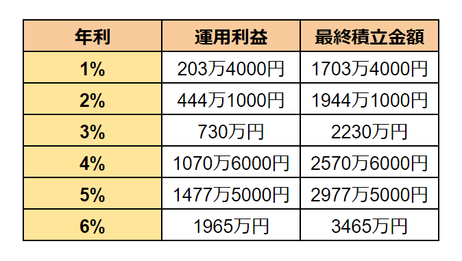いわゆる「老後2000万問題」を目安とするならば、毎月5万積み立てた場合には年利2~3%で運用できればその問題をクリアできそうです。