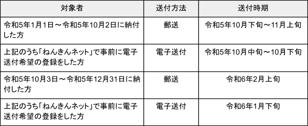 社会保険料(国民年金保険料)控除証明書は、国民年金保険料を納付した時期により以下のように送付時期が異なります。