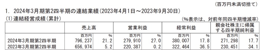 任天堂株式会社(東証プライム、7974、以下「同社」という)が、2024年3月期第2四半期連結決算(対象期間:2023年4月1日~2023年9月30日)を発表した。