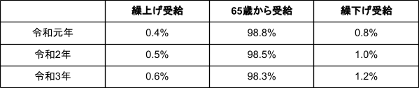 厚生年金の場合、9割以上の人が「繰上げ・繰下げ受給」をせず、65歳から受給しています。繰上げ受給を利用する人は0.5%前後とごくわずか。また、繰下げ受給についても1%前後とこちらもほんのひと握りの人が利用しているようですが、過去3年間で微増していることが見てとれます。