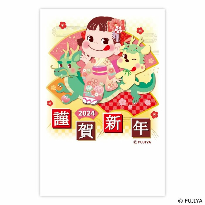 ペコちゃんの年賀はがきは毎年恒例になっている商品です。2024年用は、辰年にちなんでペコちゃんとドッグが辰(たつ)に乗ったデザインになっています。お正月らしく、着物を着たペコちゃんが愛らしいですね。宛名面のペコちゃんは、辰の着ぐるみを着用。年賀状を書くあなたも、受け取った人もきっと笑顔になれるでしょう。