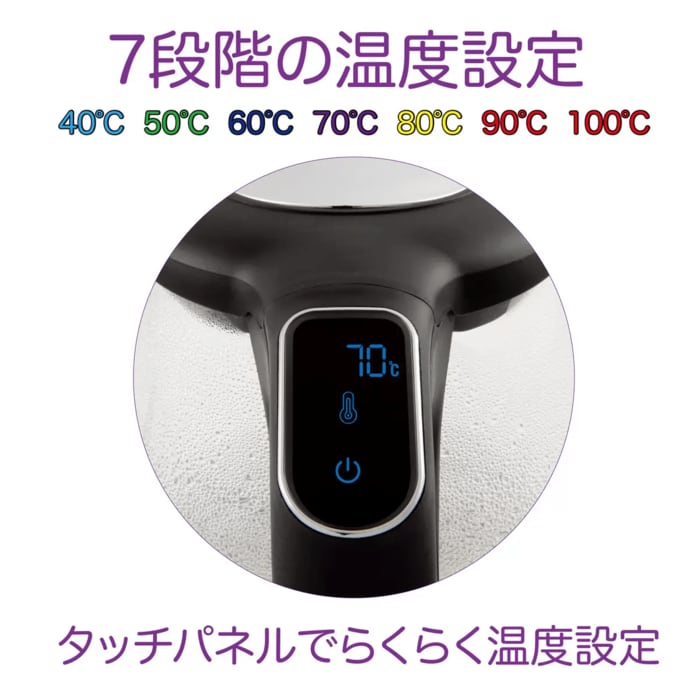 ポット下部のLEDランプの色で、水温がわかる電気ケトルです。7段階に設定温度がわかれており、保温機能も付いている優れもの。