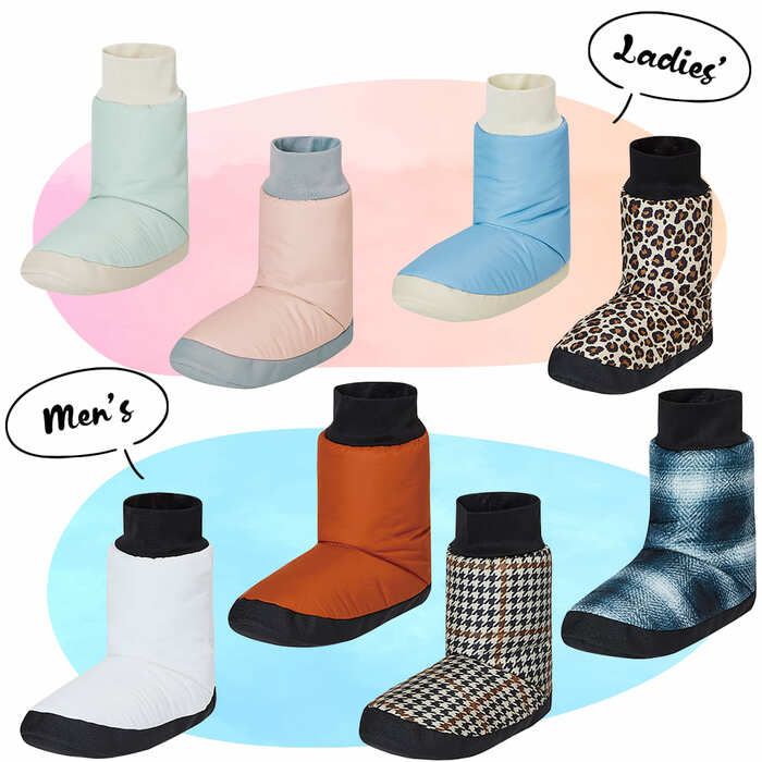 先ほどのスリッポンに対し、こちらは足首まで隠れるブーツタイプのシューズです。底面は塩化ビニルの樹脂コーティングがされており、滑り止め効果もしっかりあります。中わた入りで足首までぽかぽかなので、冷え性対策や血行促進にもおすすめです。カラー展開されているもののうち、1部は限定生産になっています。